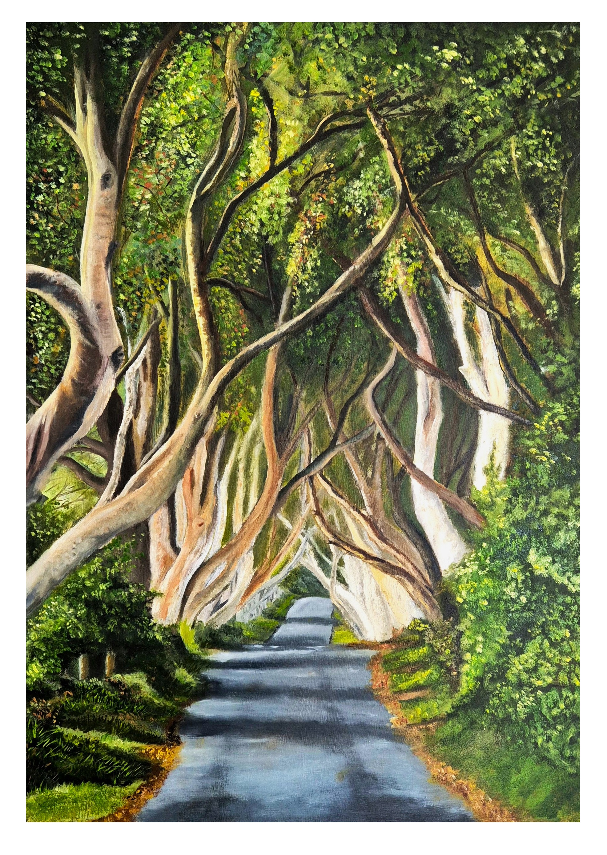 The Dark Hedges made Famous by the block buster seris Game of Thrones. Taken from my original oil painting im realising a limited edition of 100 prints . The prints will be available in size A3 and printed on archival matte paper using light fast inks for best quality. Ideal to brigthen up any room in the house for you,family and friends. posted flat for seamless delivery. A2 avaiable on request priced at £50